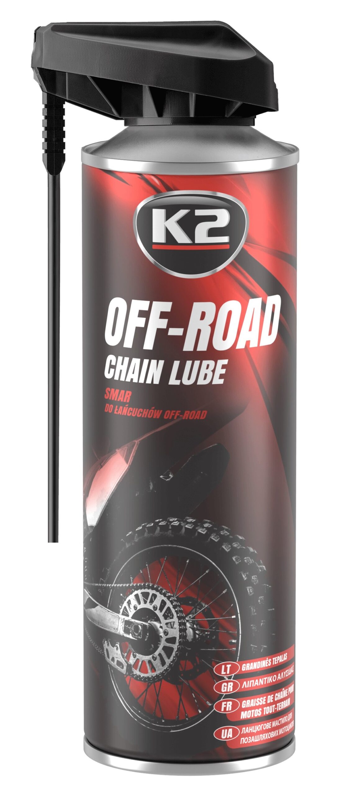 K2 Smar do łańcuchów OFF-ROAD – to wysoce wydajny smar, przeznaczony do smarowania łańcuchów oraz zębatek napędowych w motocyklach terenowych oraz quadach. Dzięki właściwościom smarująco-penetrującym, wnika we wszystkie szczeliny, chroniąc łańcuch oraz zębatki przed przedwczesnym zużyciem. Można go stosować we wszystkich typach łańcuchów, x-ring, o-ring, z-ring itp.