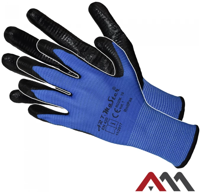 Rękawice ochronne, wykonane z dzianiny poliestrowej w kolorze niebieskim, powlekane nitrylem w kolorze czarnym, zakończone ściągaczem, bezszwowe.