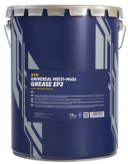 SMAR EP-2 MULTI MoS2 18KG MANNOL 8115 to uniwersalny, wielozadaniowy smar litowy przeznaczony do ekstremalnych ciśnień. Produkt bazuje na wysoko rafinowanym oleju mineralnym z dodatkami dwusiarczku molibdenu i grafitu, które zapewniają odporność na ekstremalne ciśnienie i ścieranie. Dzięki wysokiej odporności termicznej oraz zdolności uszczelniania, smar ten oferuje doskonałe właściwości przeciwcierne i jest idealny do zastosowań w trudnych warunkach.